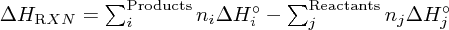 $\Delta H_{\mathrm RXN} = \sum_i^{\mathrm{Products}} n_i \Delta
