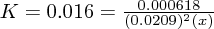 $K = 0.016 = \frac{0.000618}{(0.0209)^2(x)}$